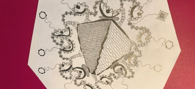 Take this most recent piece of mine as an example. I started with the idea of interconnected circles with triangular innards. Once I manifested that idea, I stopped, looked and then decided on the next stage – bold coloured edges.